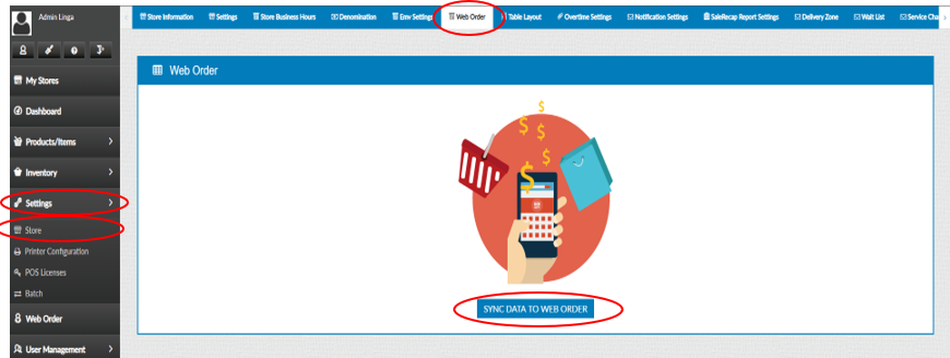 Select “Settings”, “Store”, “Web Order”, “Sync Data To Web Order”