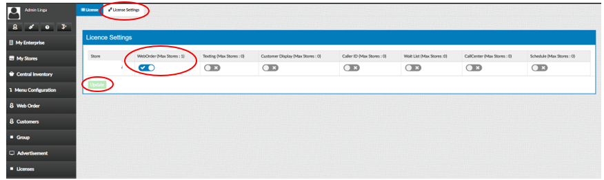 Select “License Settings” and turn on “Web Order” and press “Update”