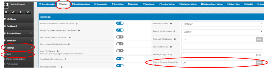 “Settings”, “Store”, “Settings” and insert “Time to Generate Future Order”