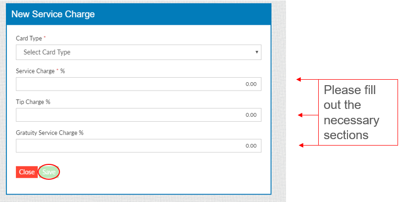 Now you will be able to add the card type and customize how much of a Service Charge percentage is needed. Select “Save” when complete