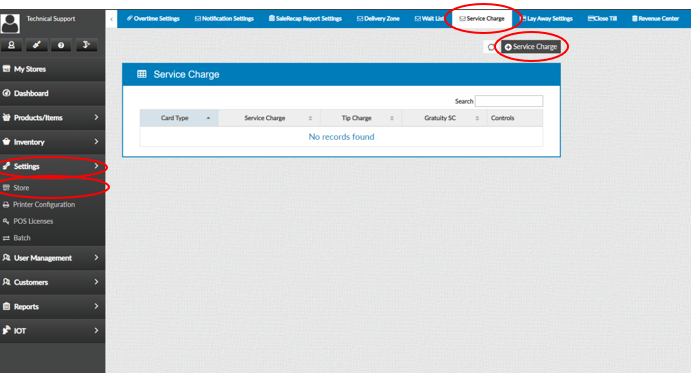 Go to “Settings”, “Store”, “Service Charge” , “+ Service Charge”